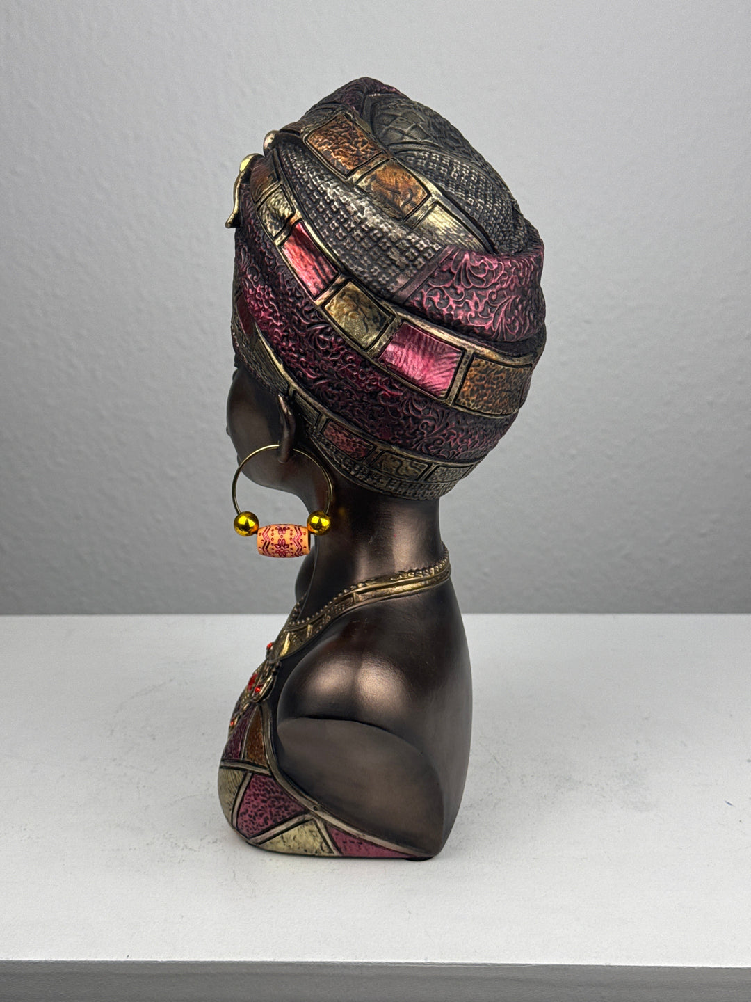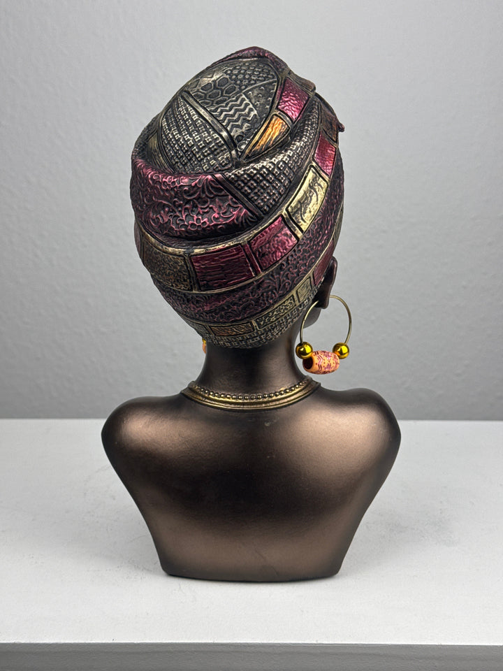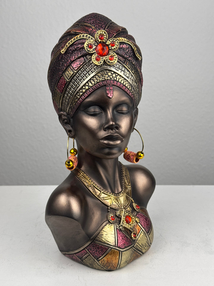 • Diese beeindruckende Büste zeigt eine afrikanische Königin mit traditionellem Kopfschmuck und Schmuck. Mit ihrer Bronzeoptik und den kulturellen Details verleiht sie jedem Raum Schönheit, Stärke und Tradition.