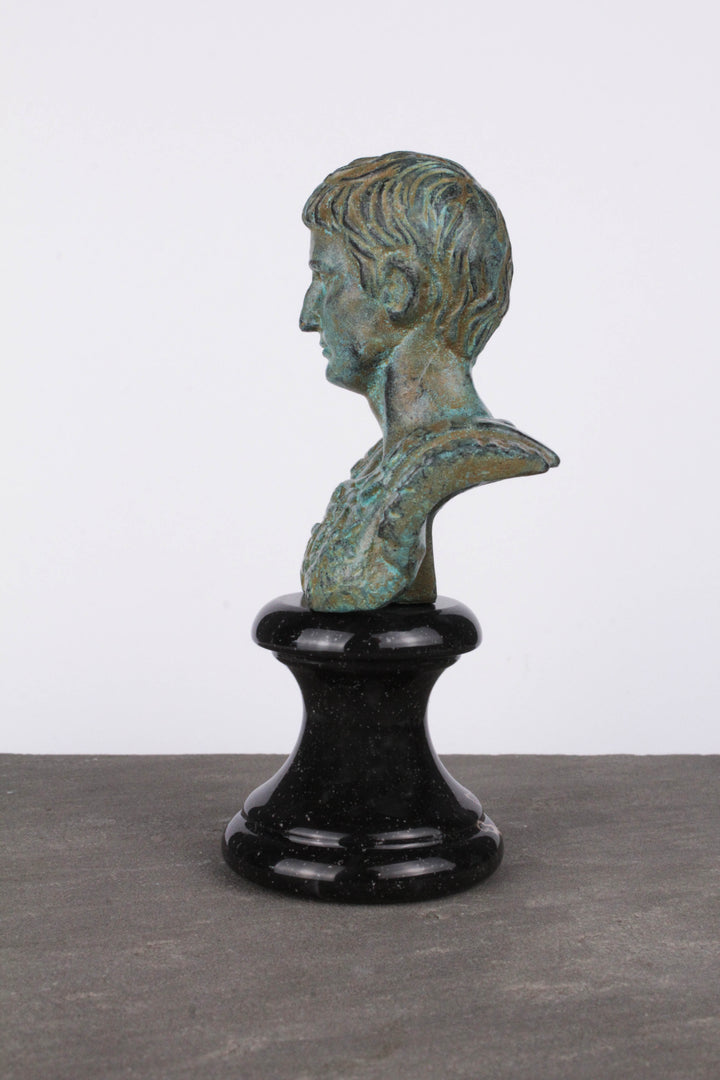 Augustus Caesar Büste, Verkleinerung inspiriert durch die antike Statue von Prima Porta. Diese Bronzebüste stellt Augustus (geboren als Gaius Octavius Thurinus) (63 v. Chr. - 14 n. Chr.), den ersten Kaiser des Römischen Reiches, dar. Als Begründer des römischen Fürstentums festigte er sein Vermächtnis als einer der effektivsten und umstrittensten Führer der Menschheitsgeschichte.