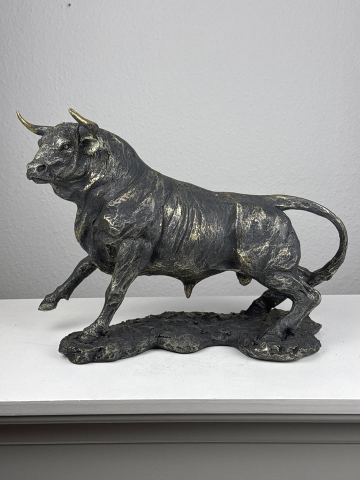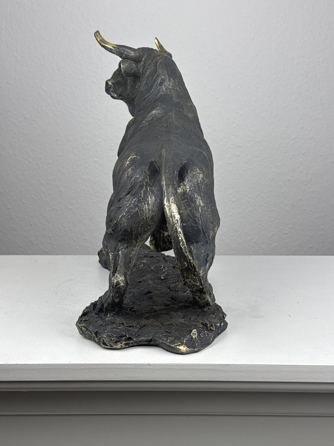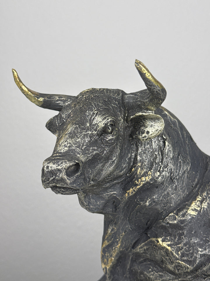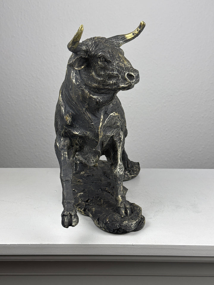 Diese Skulptur ist ein auffälliges und kraftvolles Dekorationsstück, das einen stürmenden Stier darstellt und Stärke und Entschlossenheit symbolisiert. Mit ihrer schwarzem Messingfinish und ihrer dynamischen Form setzt sie auf Schreibtischen, Regalen oder als Geschenk zur Würdigung von Durchhaltevermögen und Ehrgeiz ein eindrucksvolles Statement.