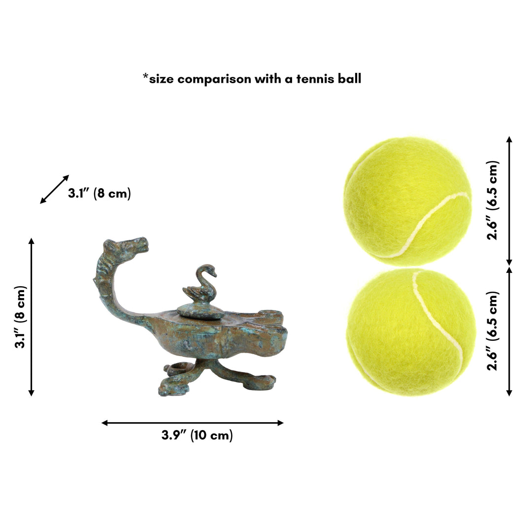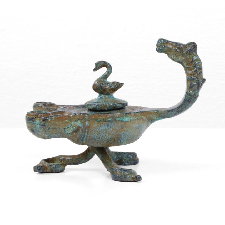 Römische Bronzelampe mit großem Pferdekopfgriff, 2 Ausgussöffnungen und einem schönen Deckel mit Schwan. Eine Öllampe in perfekter Größe zur Dekoration des Schreibtisches oder Regals.