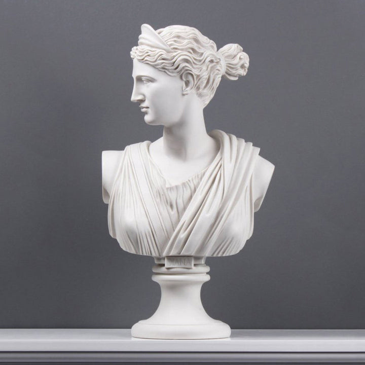 Diana Chasseresse-Büste, verkleinerte Reproduktion nach der leicht überlebensgroßen antiken Statue im Louvre-Museum in Paris. Das Original ist eine römische Kopie (1.–2. Jh. n. Chr.) eines griechischen Bronzeoriginals von ca. 325 v. Chr., das Leochares zugeschrieben wird.