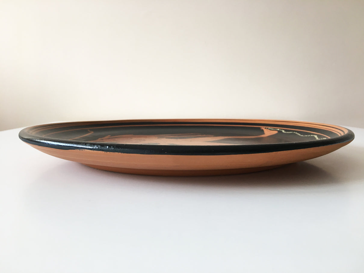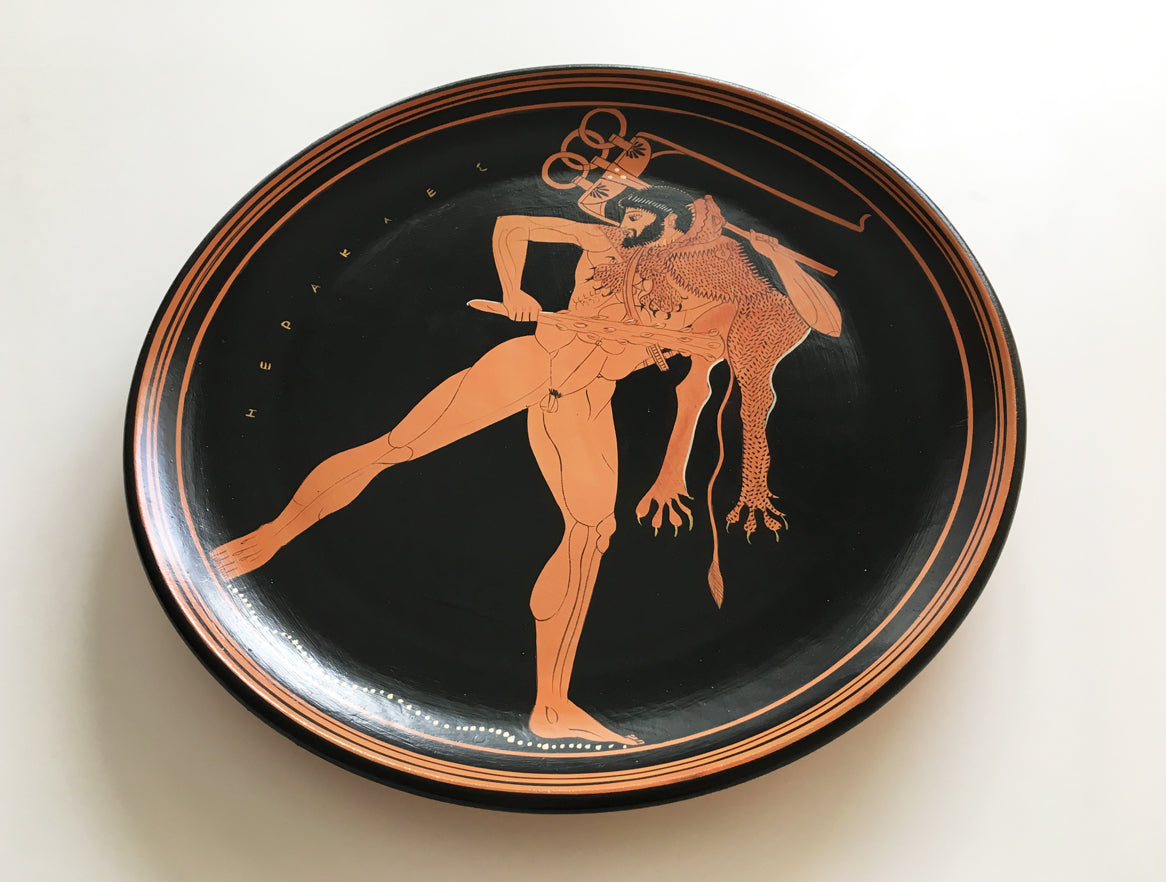 Diese beeindruckende rotfigurige griechische Platte ist eine hochwertige, handbemalte Replik eines originalen historischen Gefäßes aus Athen. Die Platte zeigt Herakles mit seiner Keule und dem Fell des nemeischen Loe wen ueber der Schulter. Die Platte kann an der Wand aufgehaengt werden.