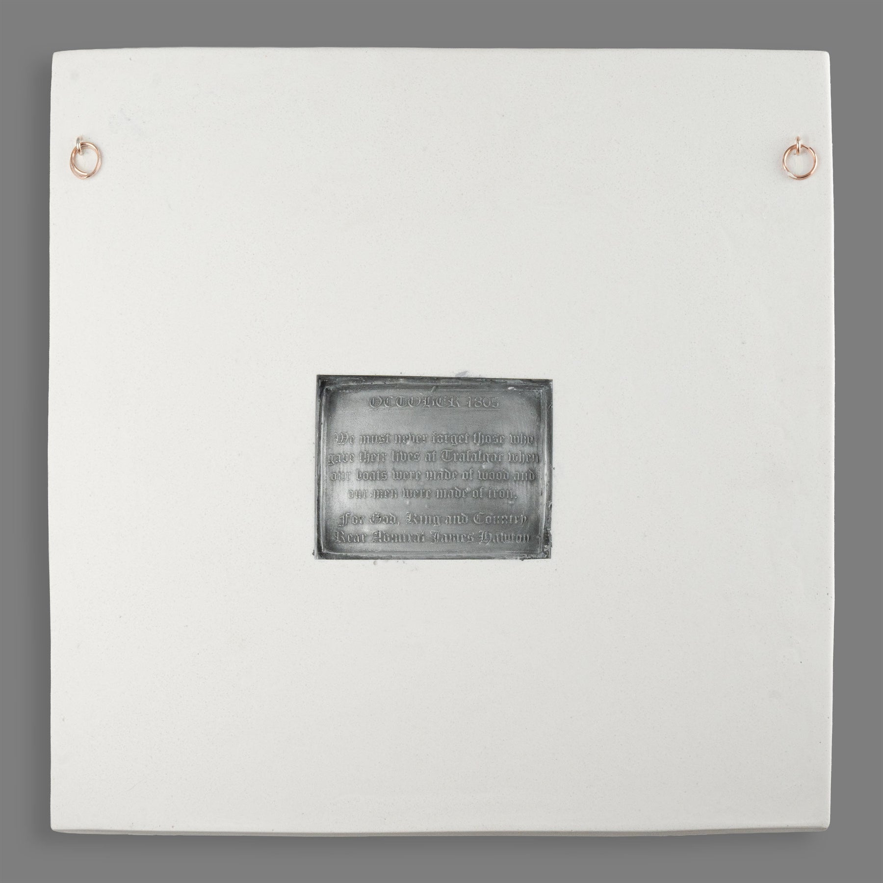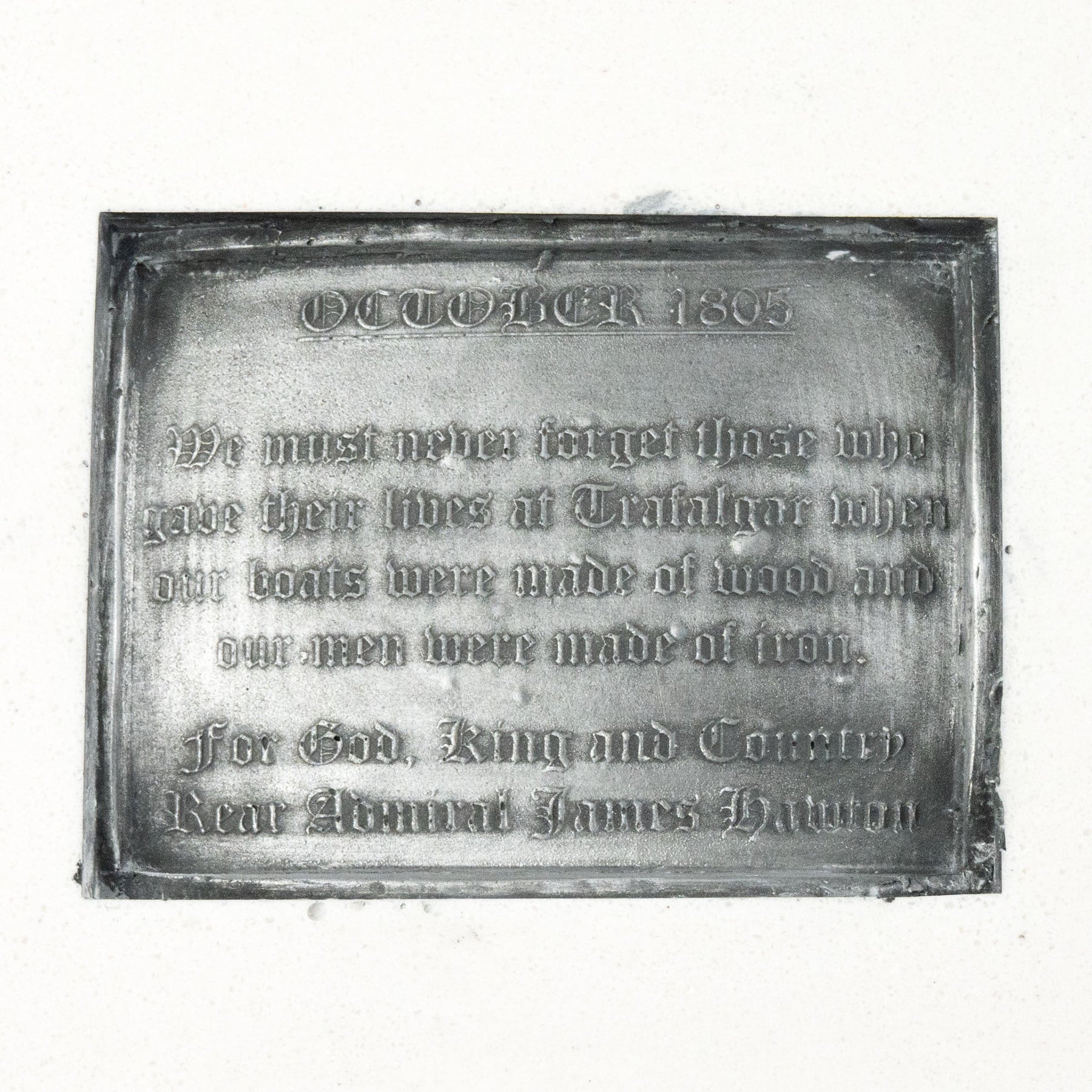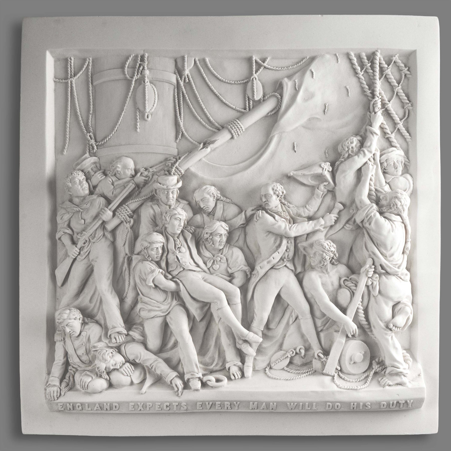 Dieses detailreiche Basrelief ist eine Reproduktion des ikonischen Bronzeplatten-Motivs am Sockel der Nelsonsäule auf dem Trafalgar Square in London. Es erinnert an den Tod von Admiral Lord Nelson in der Schlacht von Trafalgar im Jahr 1805 und zeigt sein berühmtes Signal: „England erwartet, dass jeder seine Pflicht tut.“ Ursprünglich 1849 von John Edward Carew geschaffen, würdigt dieses Werk Mut, Opferbereitschaft und das maritime Erbe Großbritanniens.