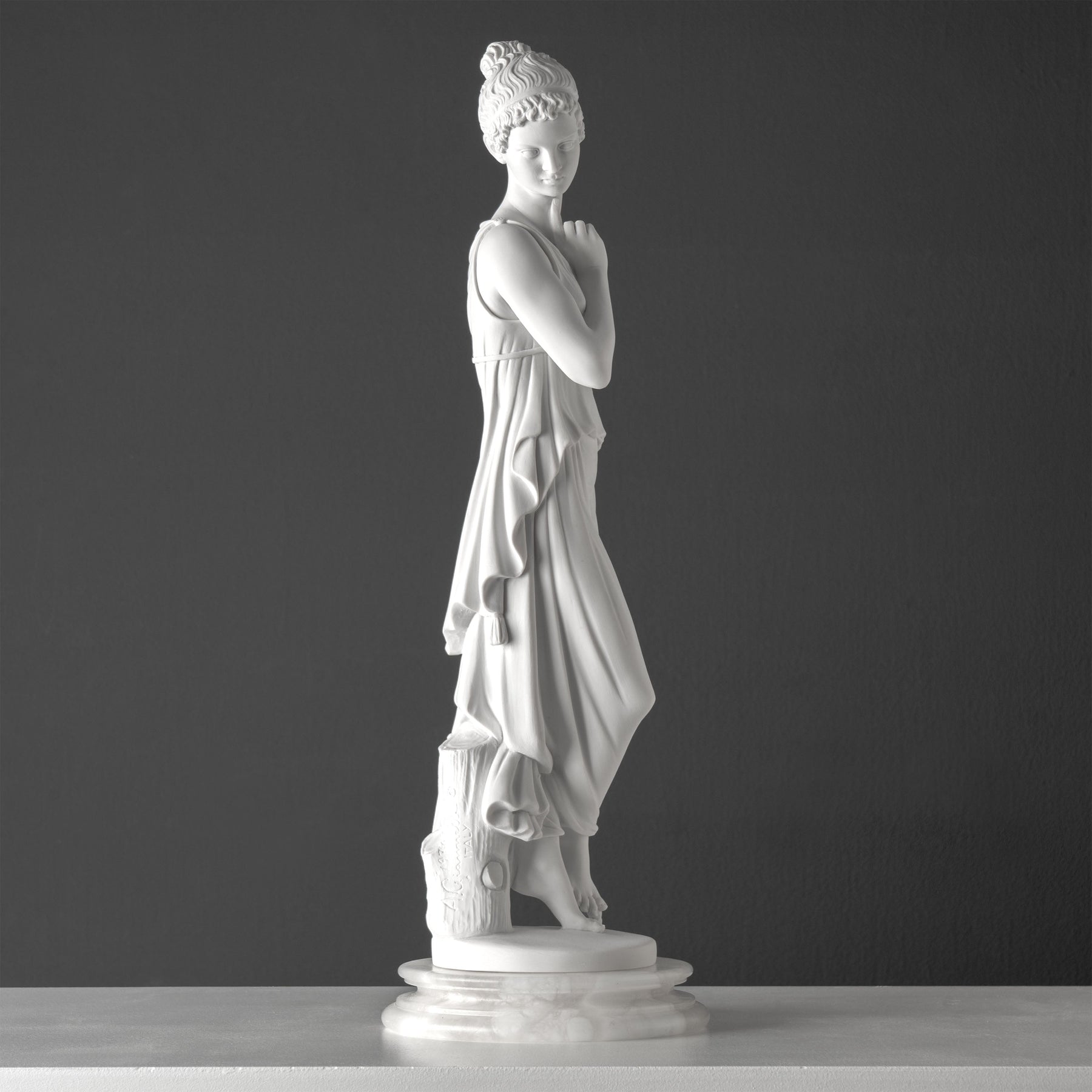 Unsere Skulpturen aus gepresstem Marmor bestehen aus einer Mischung aus weißem Carrara-Marmorstaub und hochwertigem Kunstharz als Bindemittel. Diese einzigartige Kombination ermöglicht eine außergewöhnlich feine Detailgenauigkeit bei jeder Skulptur. Jede einzelne wird sorgfältig von Hand nachbearbeitet, um eine feinmatte Oberfläche zu erzielen, die an die Textur von Biskuitporzellan erinnert.