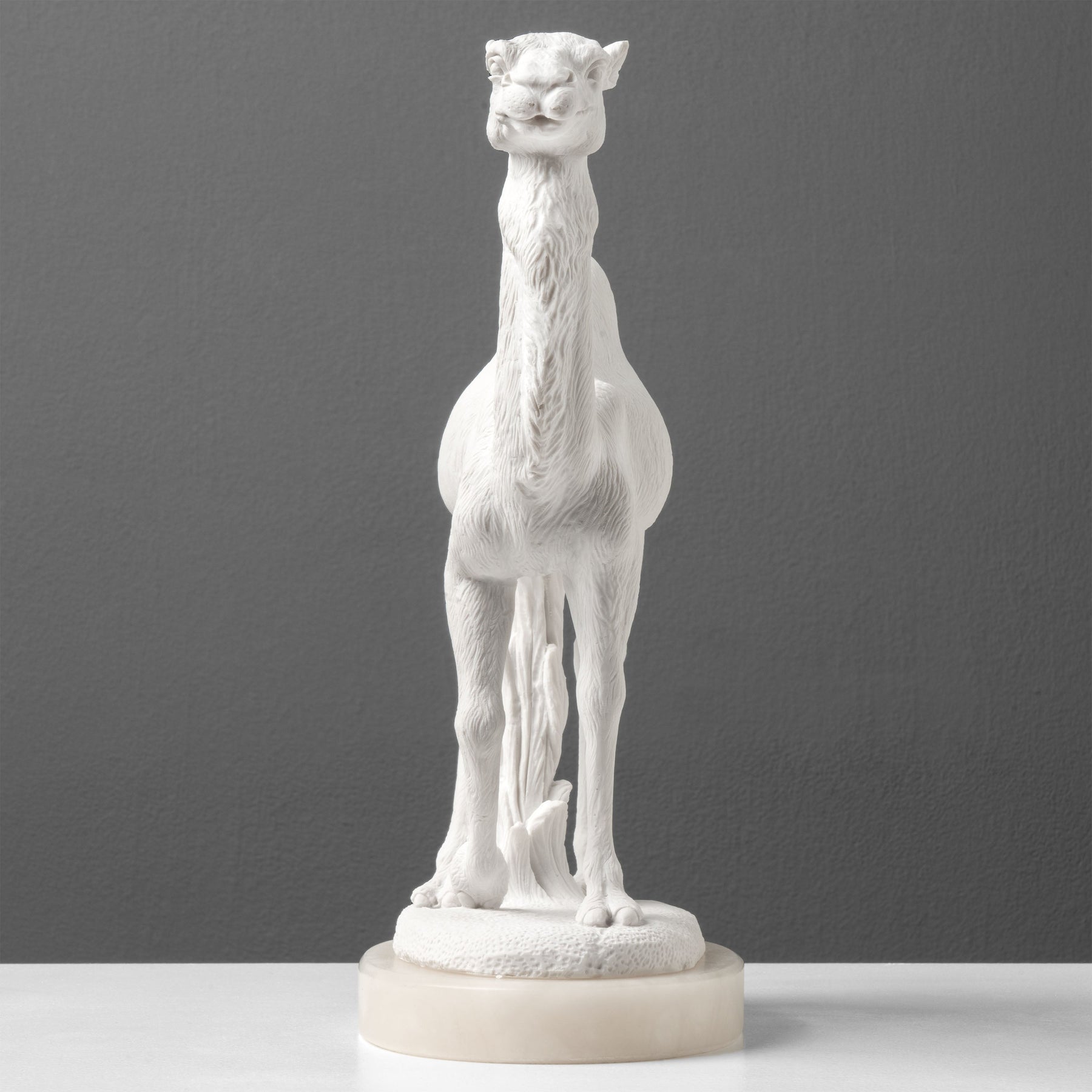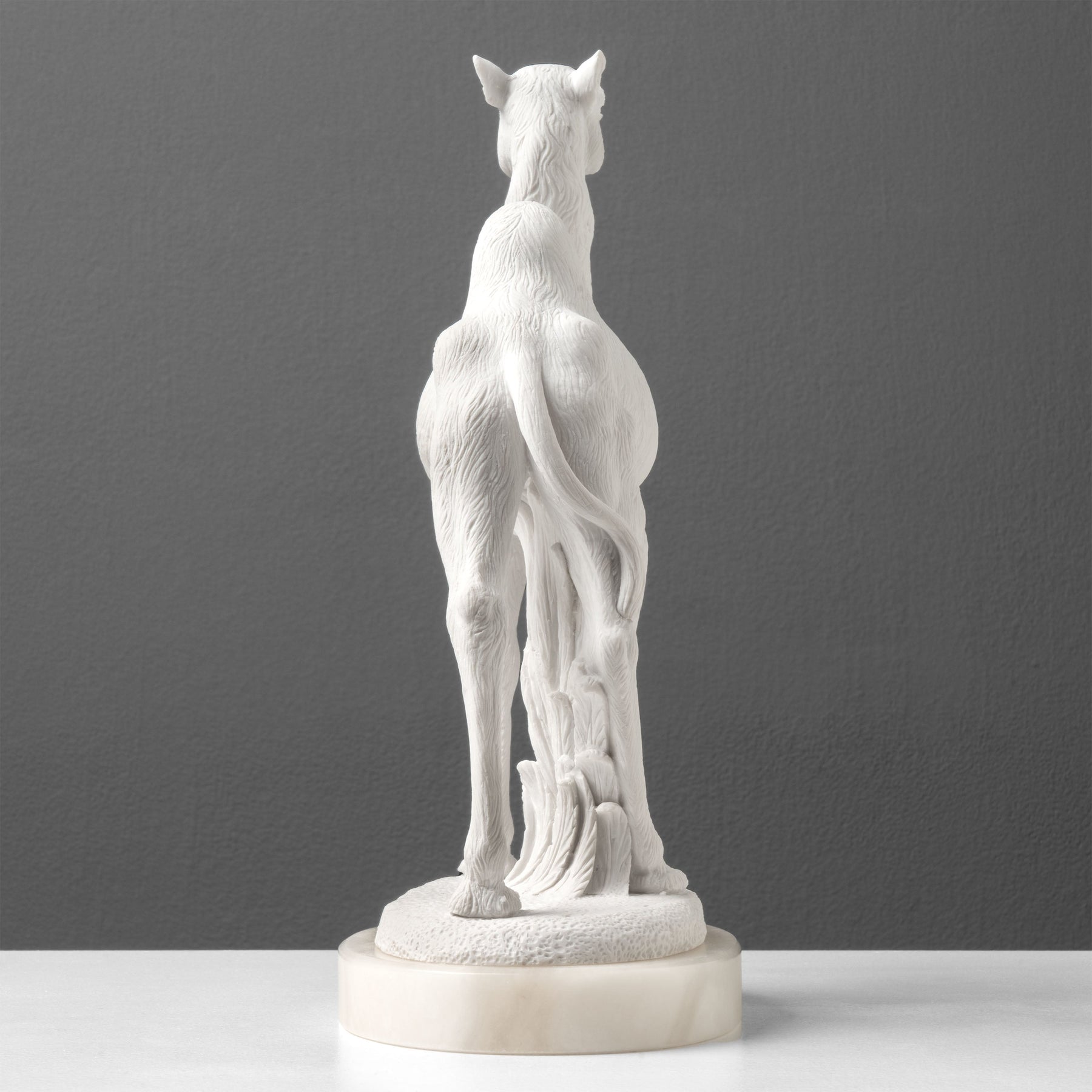Jede Skulptur ist auf einem soliden Sockel aus Alabaster montiert, der aufgrund seiner natürlichen Schönheit und seines charakteristischen Aussehens ausgewählt wurde. Alabaster ist ein feinkörniger, transluzenter Naturstein, der für seinen weichen, diffusen Glanz bei Lichteinfall bekannt ist – dies verleiht der Skulptur darüber zusätzliche Tiefe. Die glatte, polierte Oberfläche des Sockels steht in elegantem Kontrast zur matten, porzellanähnlichen Textur des Kunstwerks und sorgt so für eine harmonische Gesamtwirkung.