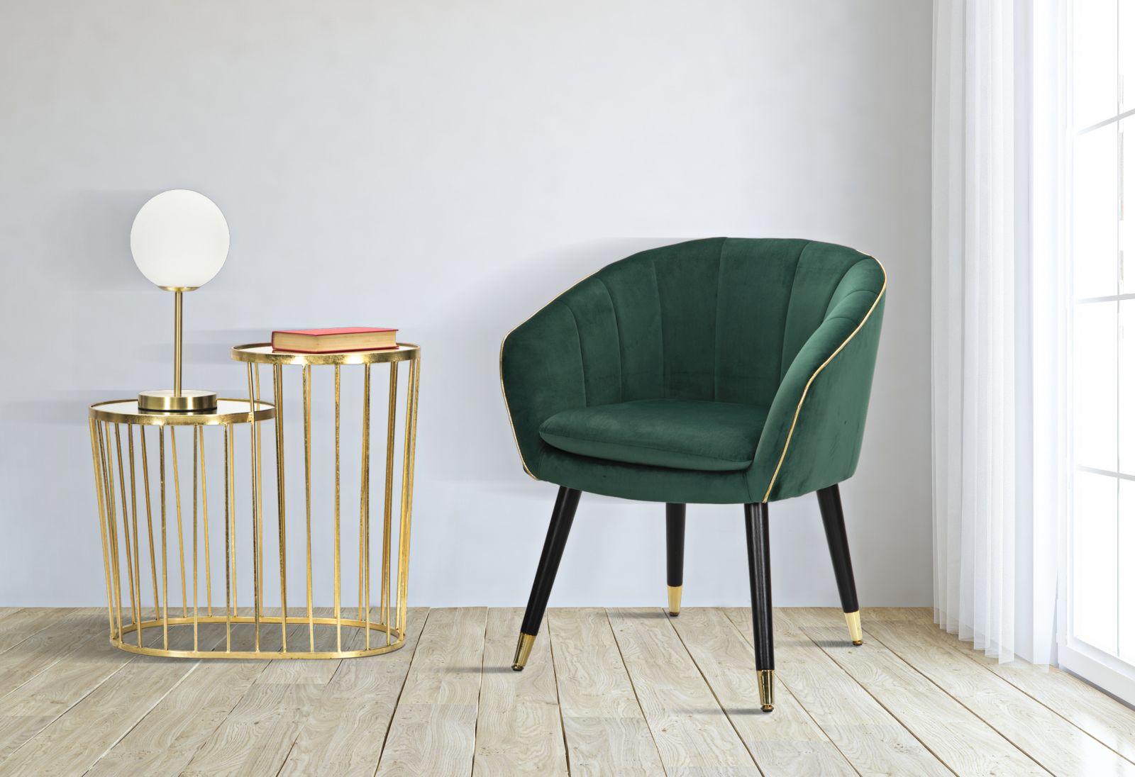 Grüner gepolsterter Sessel mit schwarzen Holzbeinen und goldenen Details