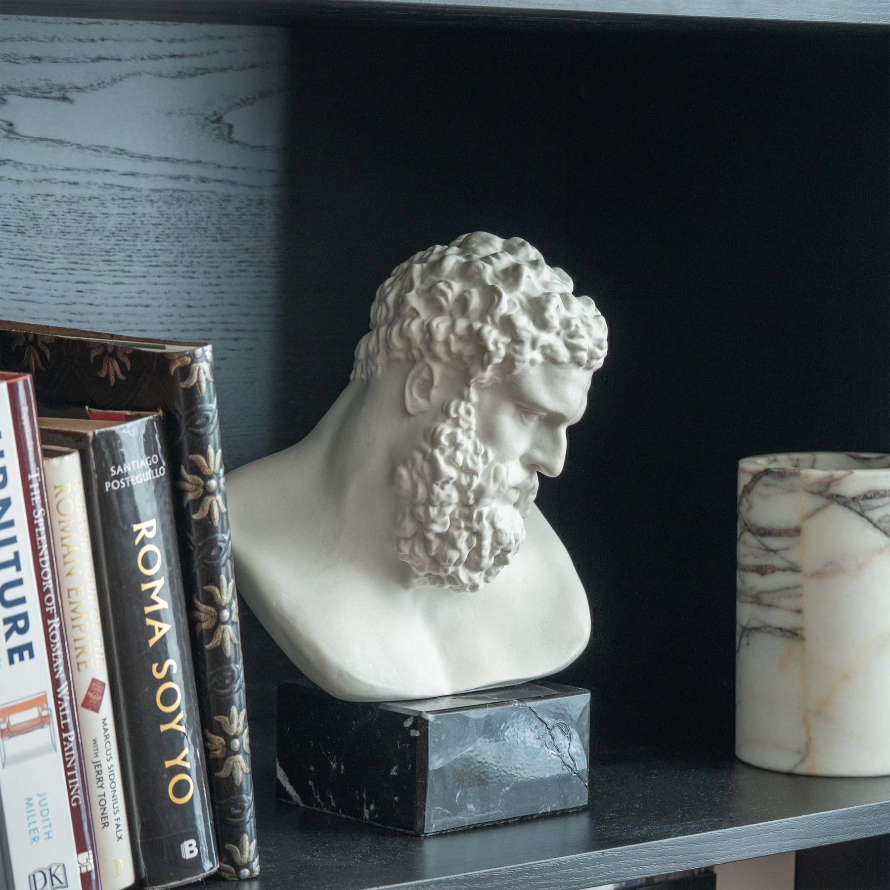 Auf einem polierten Sockel aus schwarzem Marmor montiert, gewinnt die Büste an Kontrast und fester Präsenz. Der dunkle Stein trägt die leuchtende Form darüber, verwandelt Licht und Schatten in Skulptur – jede Locke, jede Fläche des Gesichts erscheint mit musealer Klarheit. Der Marmor verleiht Gravitas, Stabilität und eine zeitlose Vollendung, die das Stück von Dekor zu Erbstück erhebt.