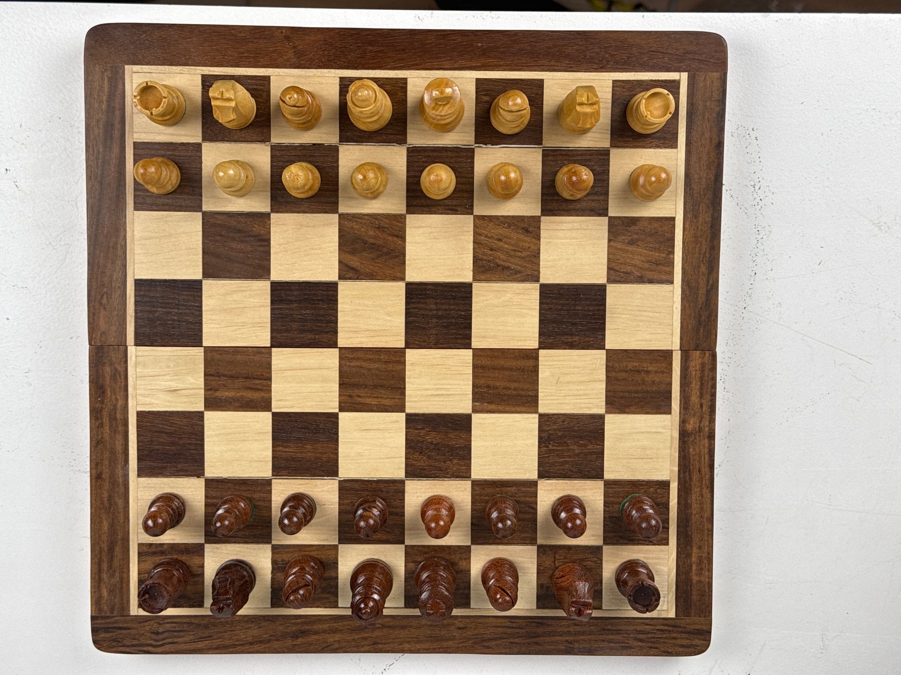 Dieses kompakte Schachspiel aus Holz vereint traditionelles Design mit Funktionalität. Mit seinen geschnitzten Figuren und dem glatten Schachbrett eignet es sich ideal für Reisen, zum gelegentlichen Spielen oder als dekoratives Accessoire.