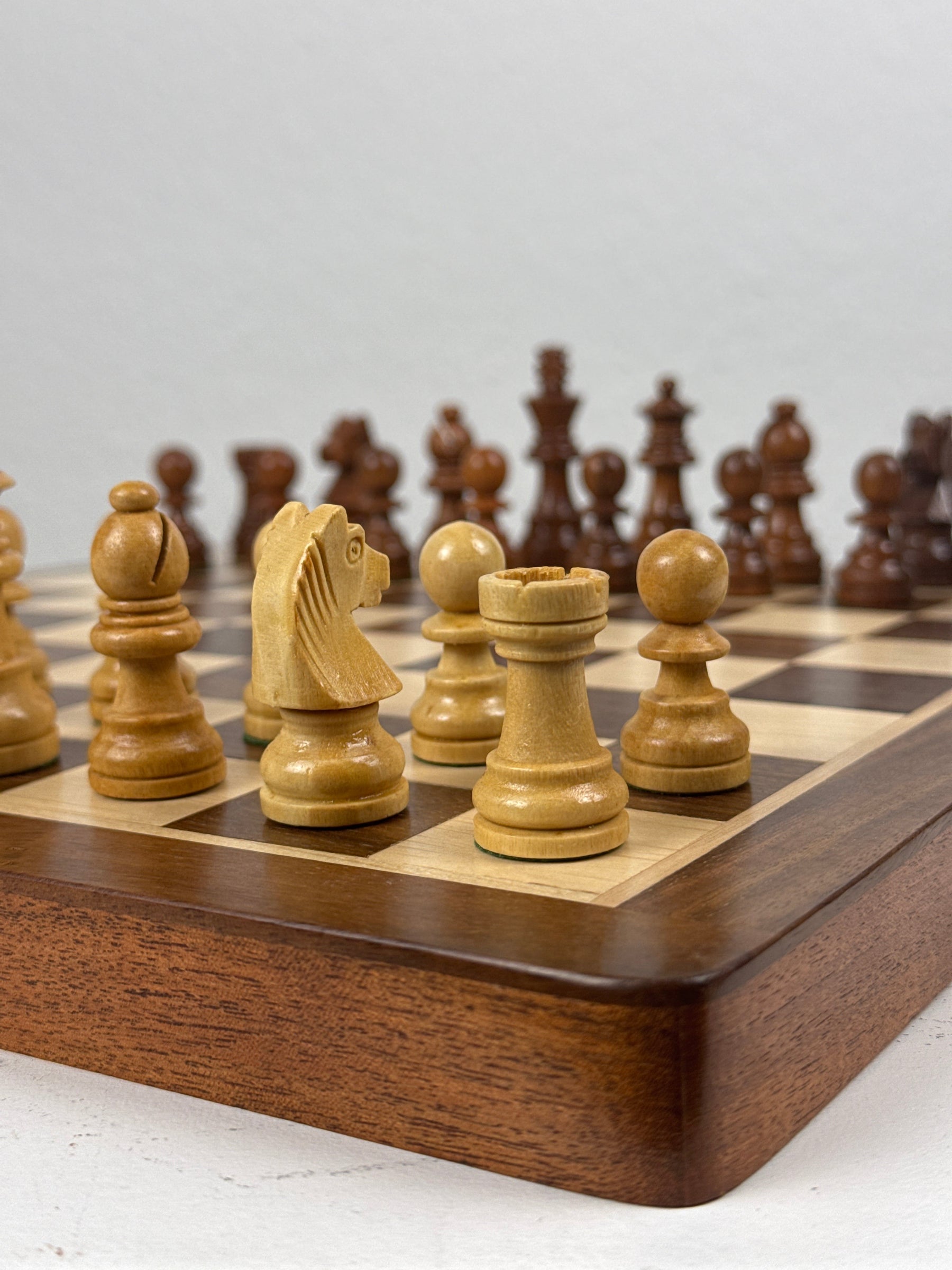 Das Set aus hochwertigem Holz in zwei natürlichen Farbtönen vereint Schönheit und Funktionalität – perfekt für die Präsentation oder zum regelmäßigen Spielen. Ein großartiges Geschenk für Schachliebhaber jeden Alters.