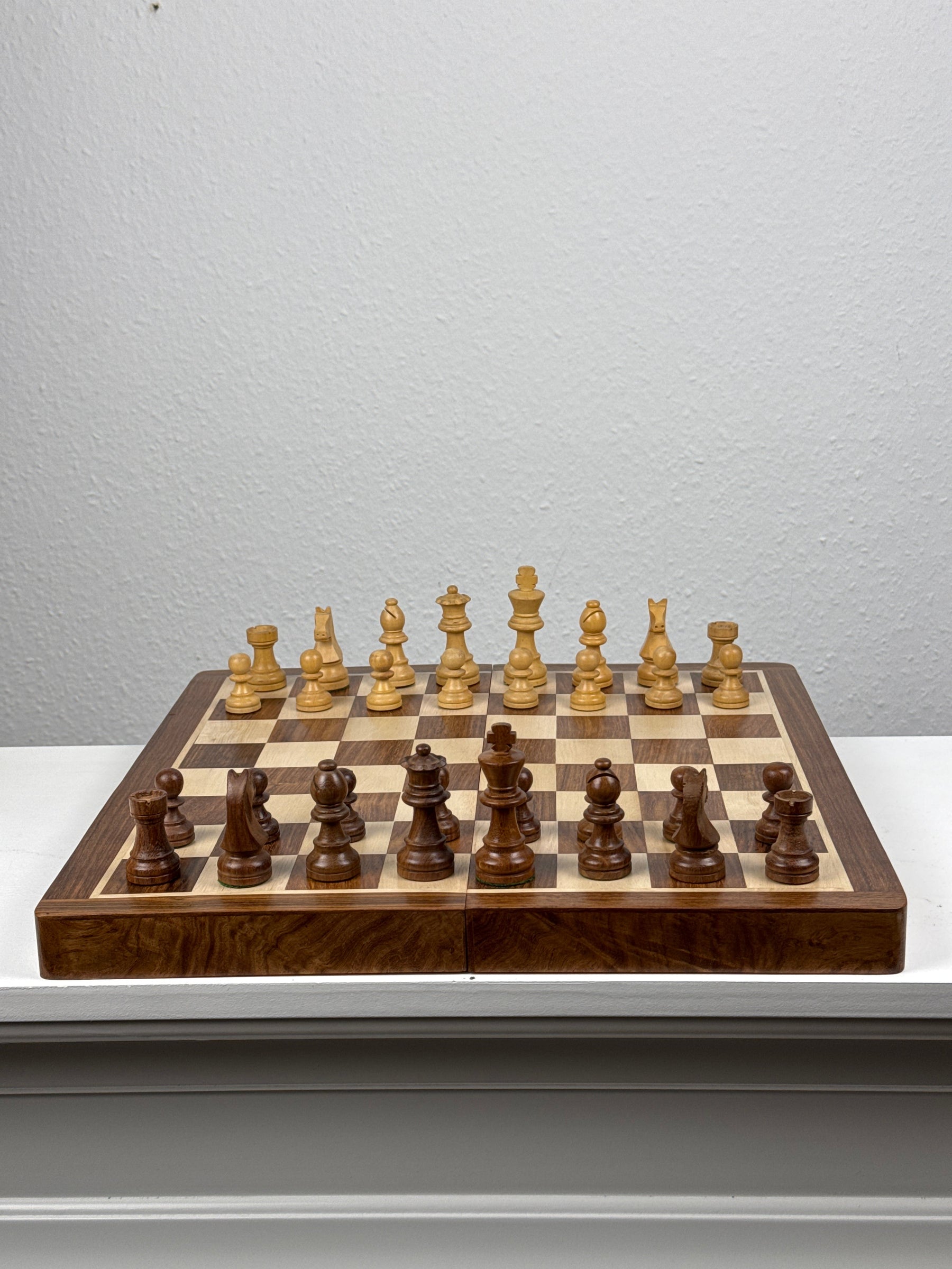 • Dieses kompakte Schachspiel aus Holz vereint traditionelles Design mit Funktionalität. Mit seinen geschnitzten Figuren und dem glatten Schachbrett eignet es sich ideal für Reisen, zum gelegentlichen Spielen oder als dekoratives Accessoire.