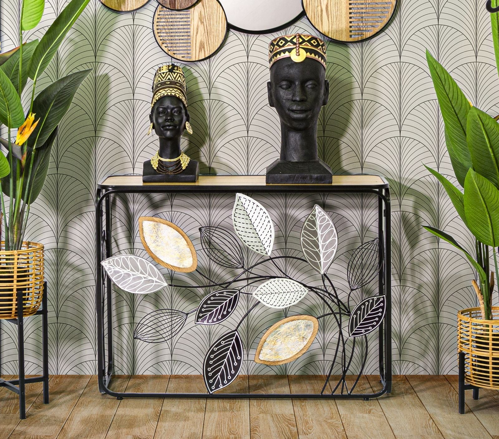 Rechteckiger Konsolentisch aus Metall und Holz mit Blättermuster