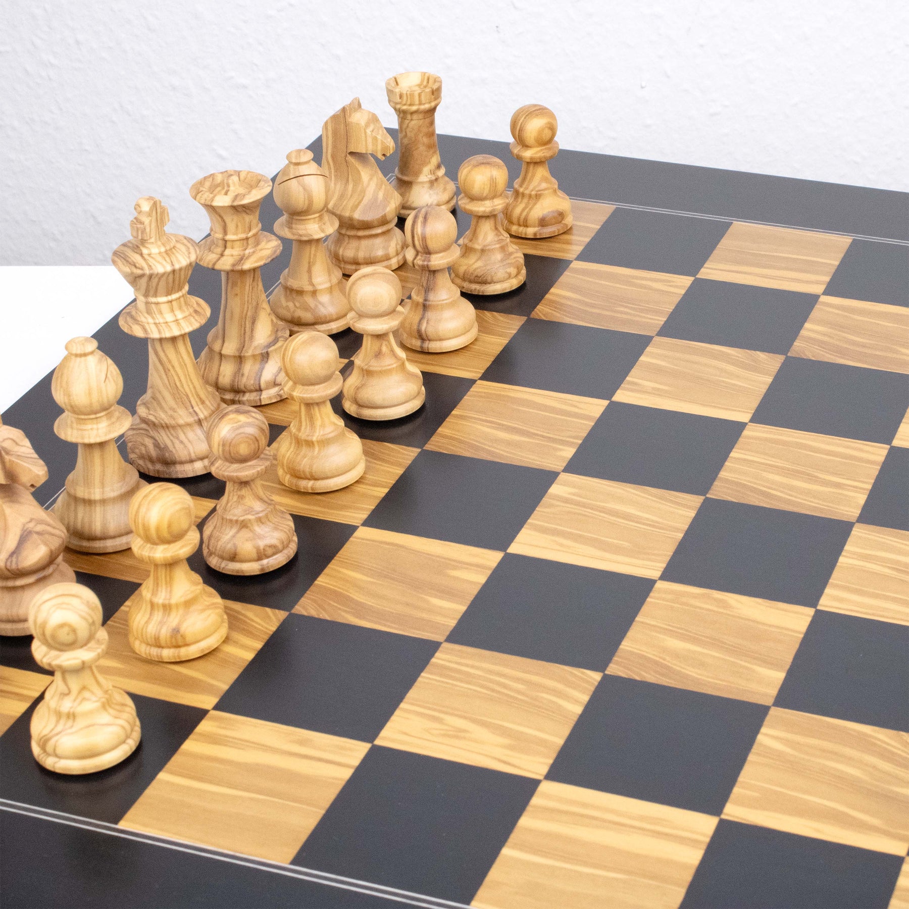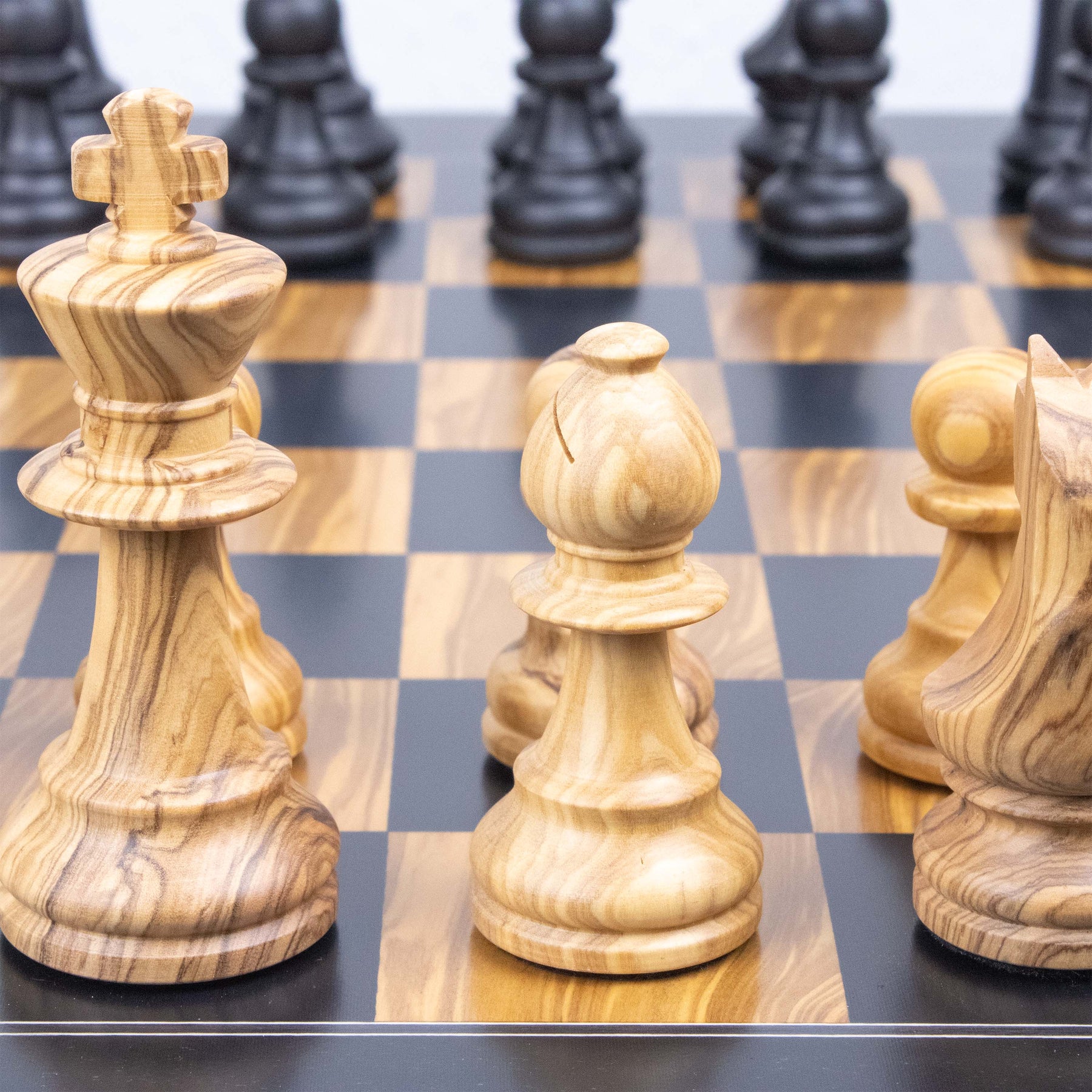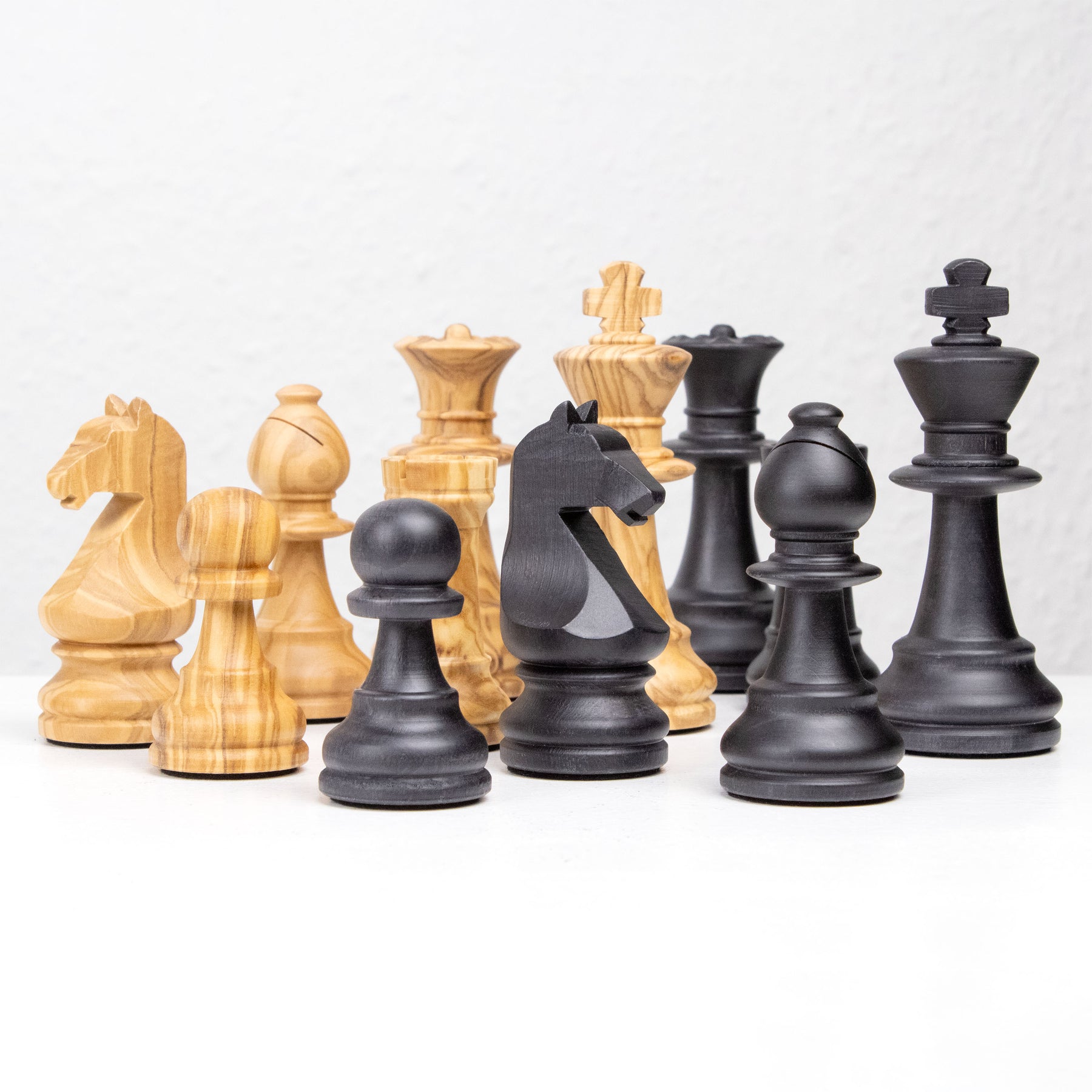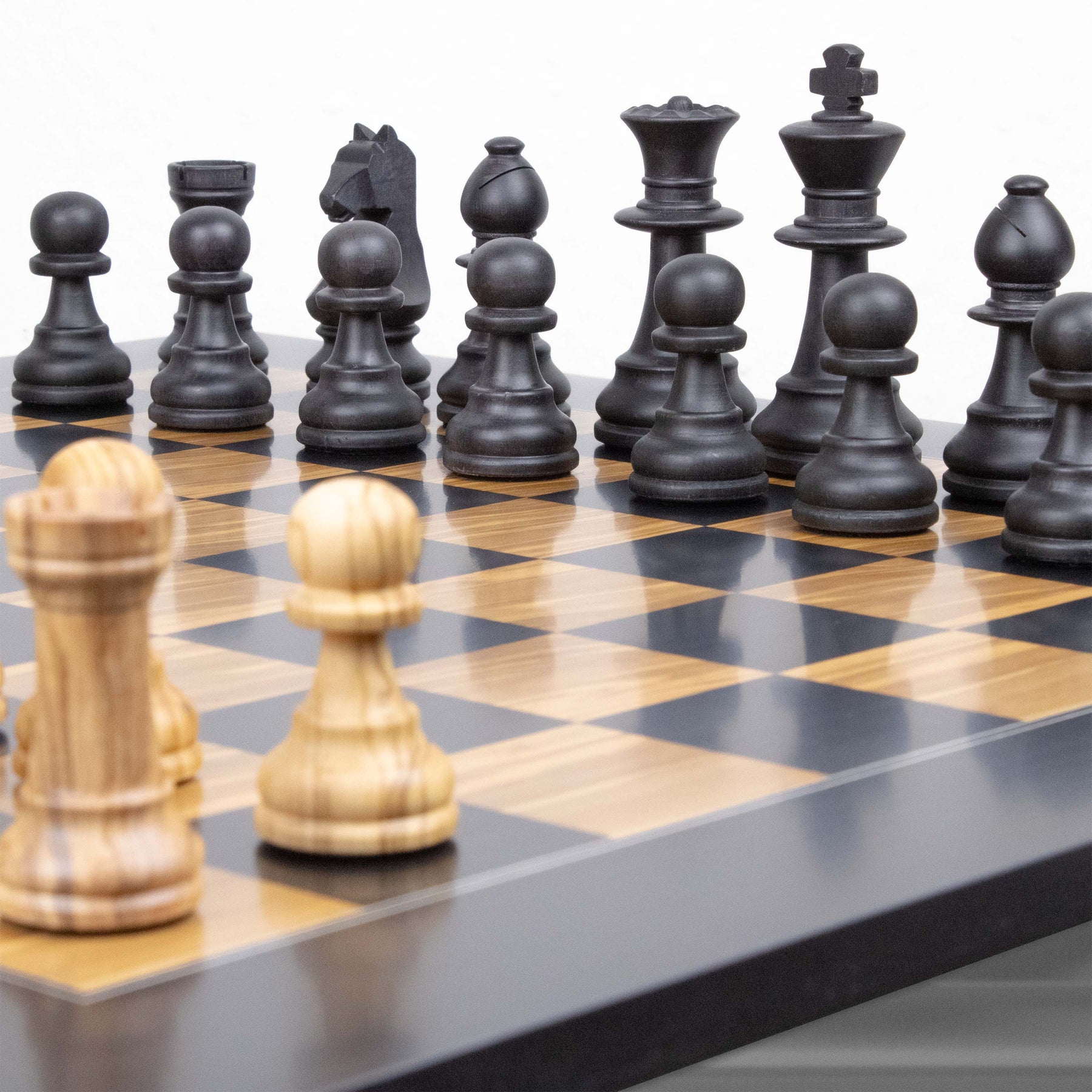 Eine zeitlose Verbindung aus Tradition und natürlicher Schönheit: Dieses Staunton Schachset präsentiert handgefertigte Figuren aus zwei edlen Hölzern. Die dunklen Figuren sind aus tiefschwarzem, gebeiztem Buchsbaumholz mit matter Oberfläche geschnitzt, während die hellen Figuren die warme, strukturierte Maserung des Olivenholzes zeigen.